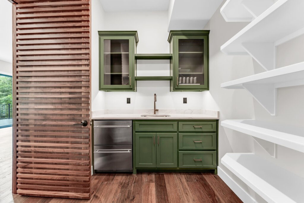 An expansive chef’s kitchen with high-end appliances and a massive walk-in pantry featuring a custom door