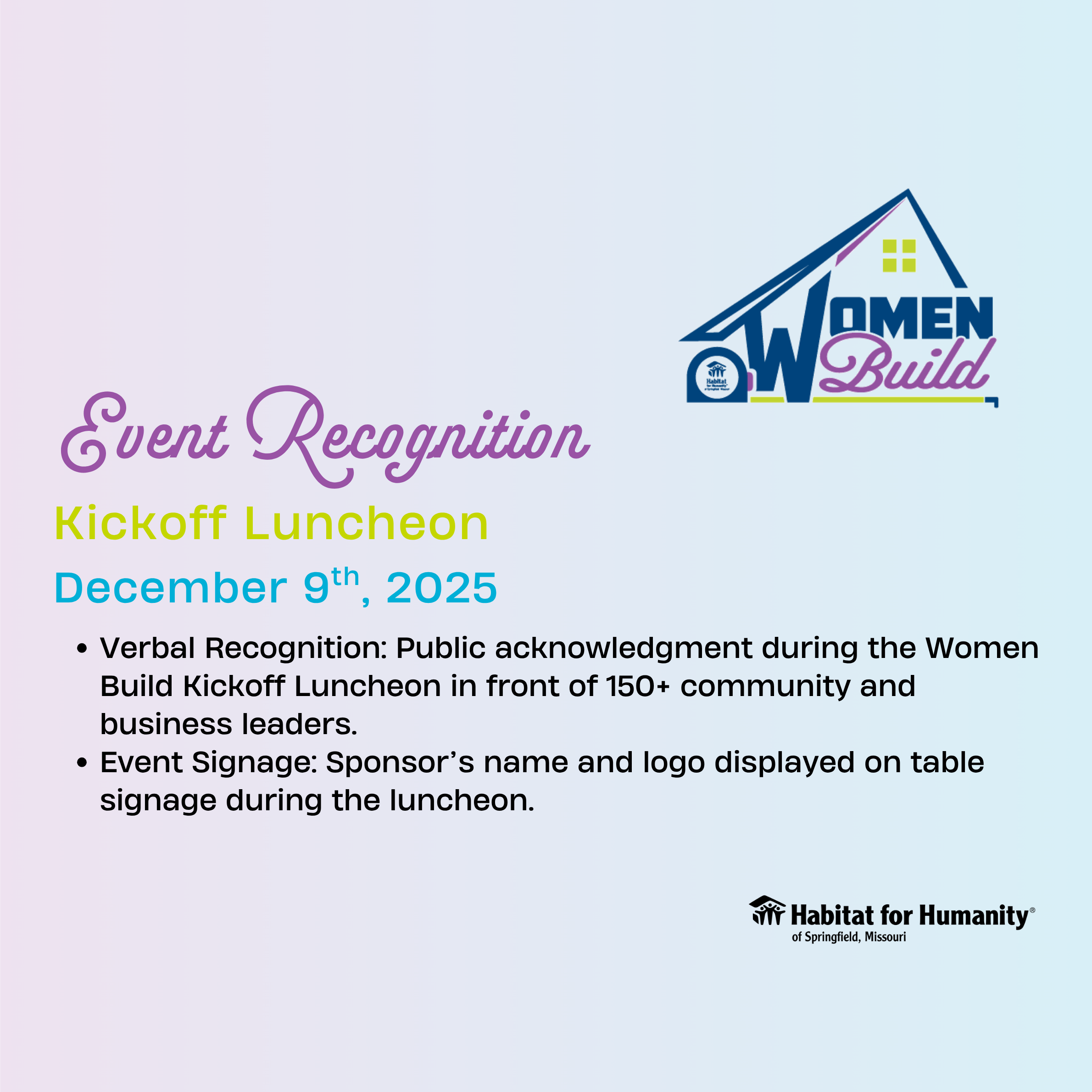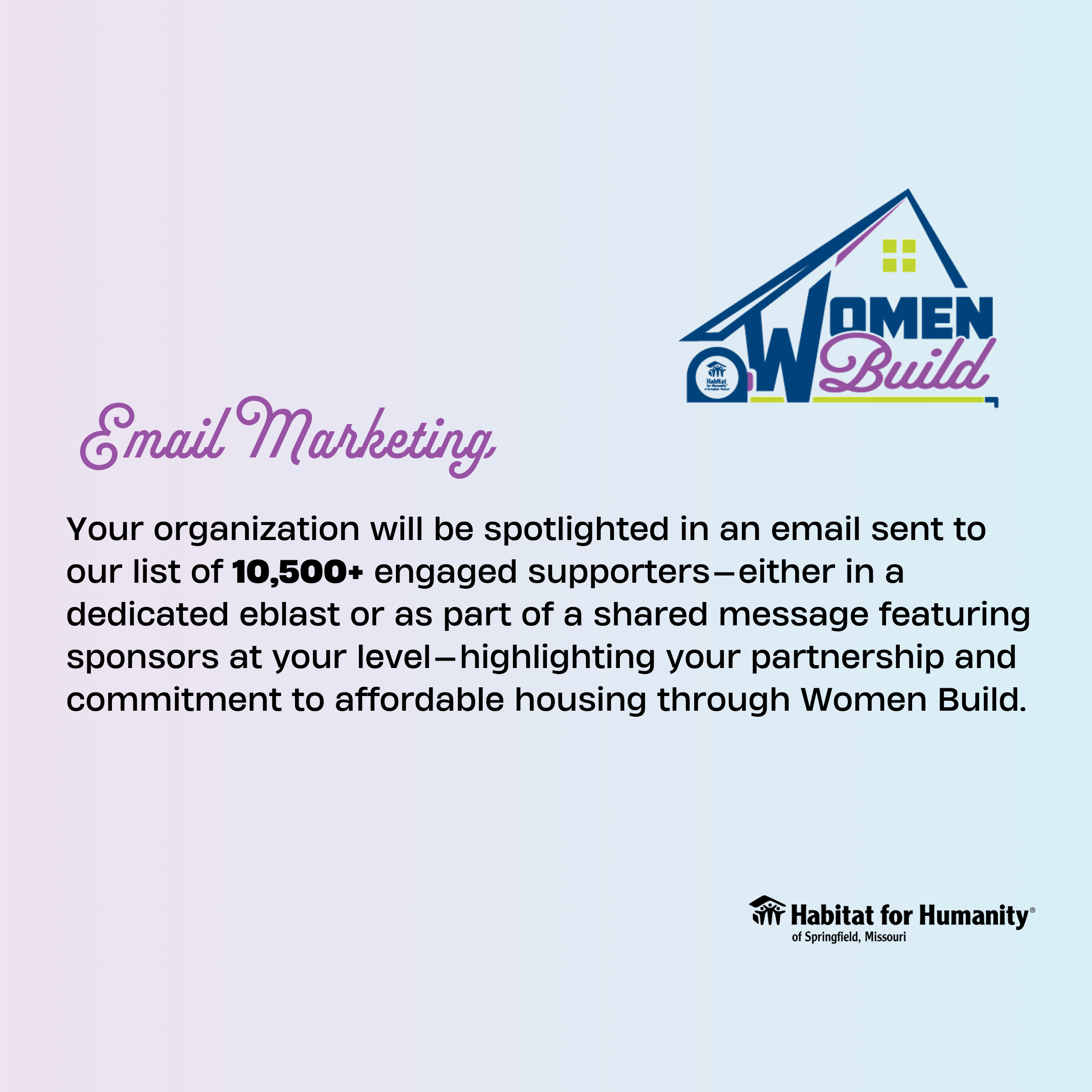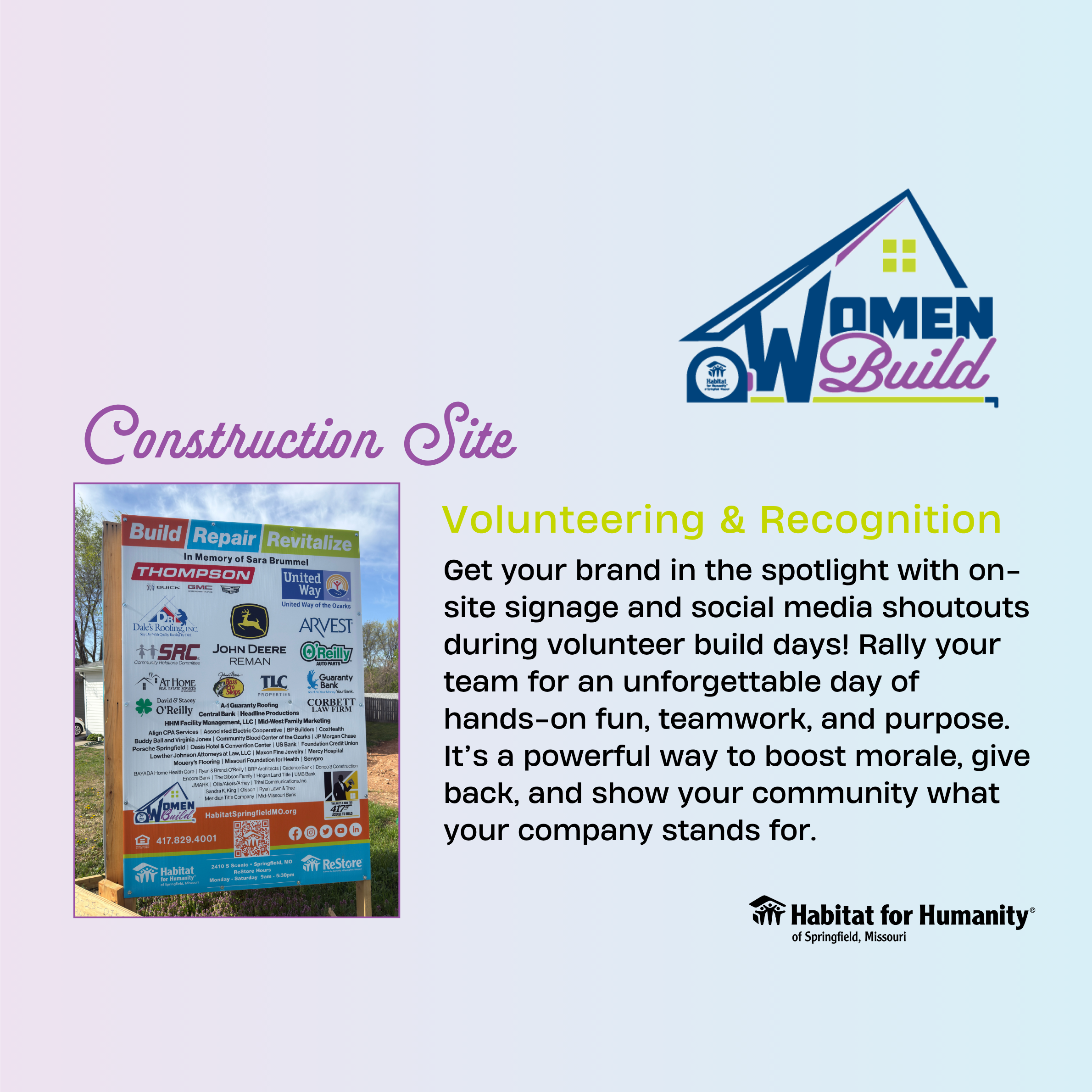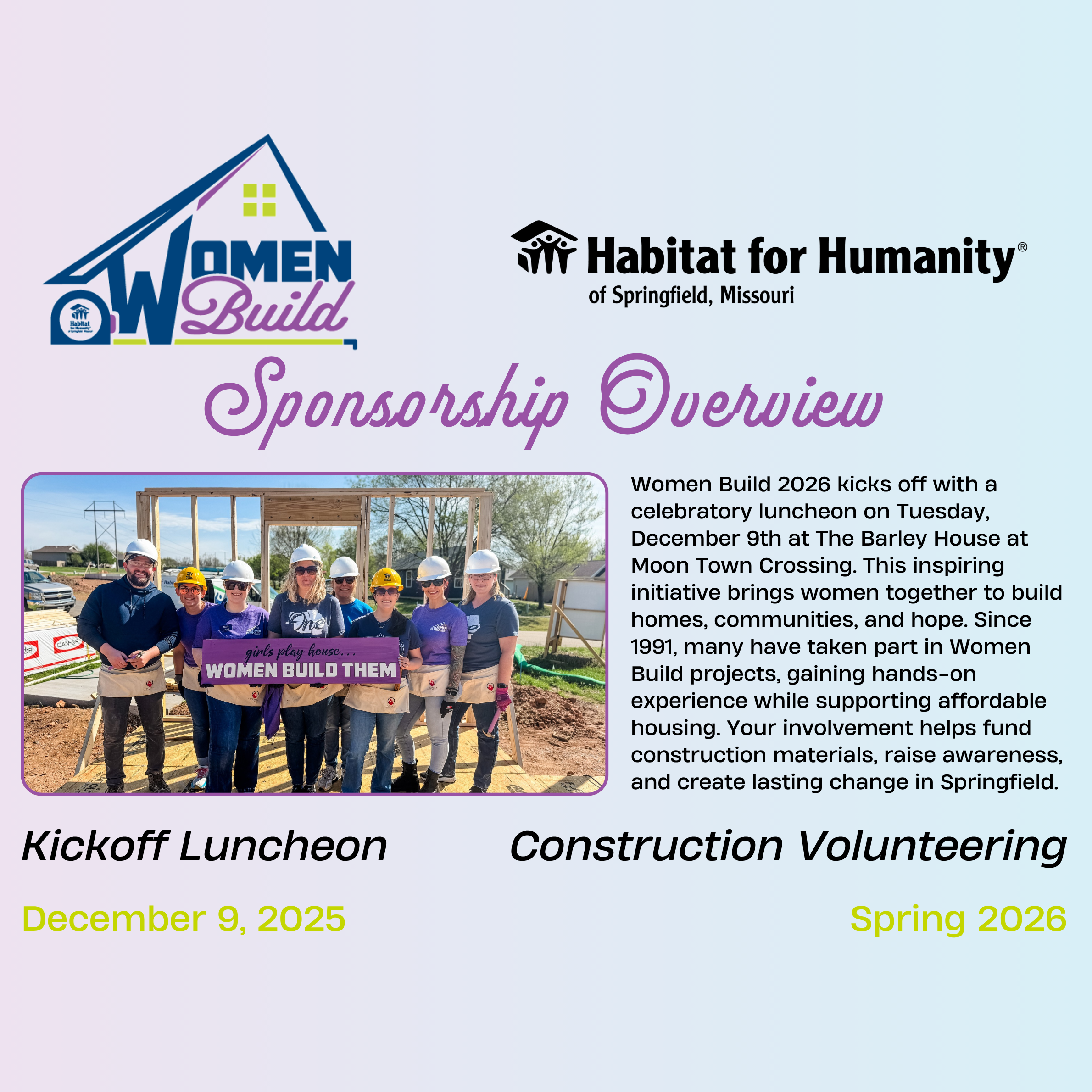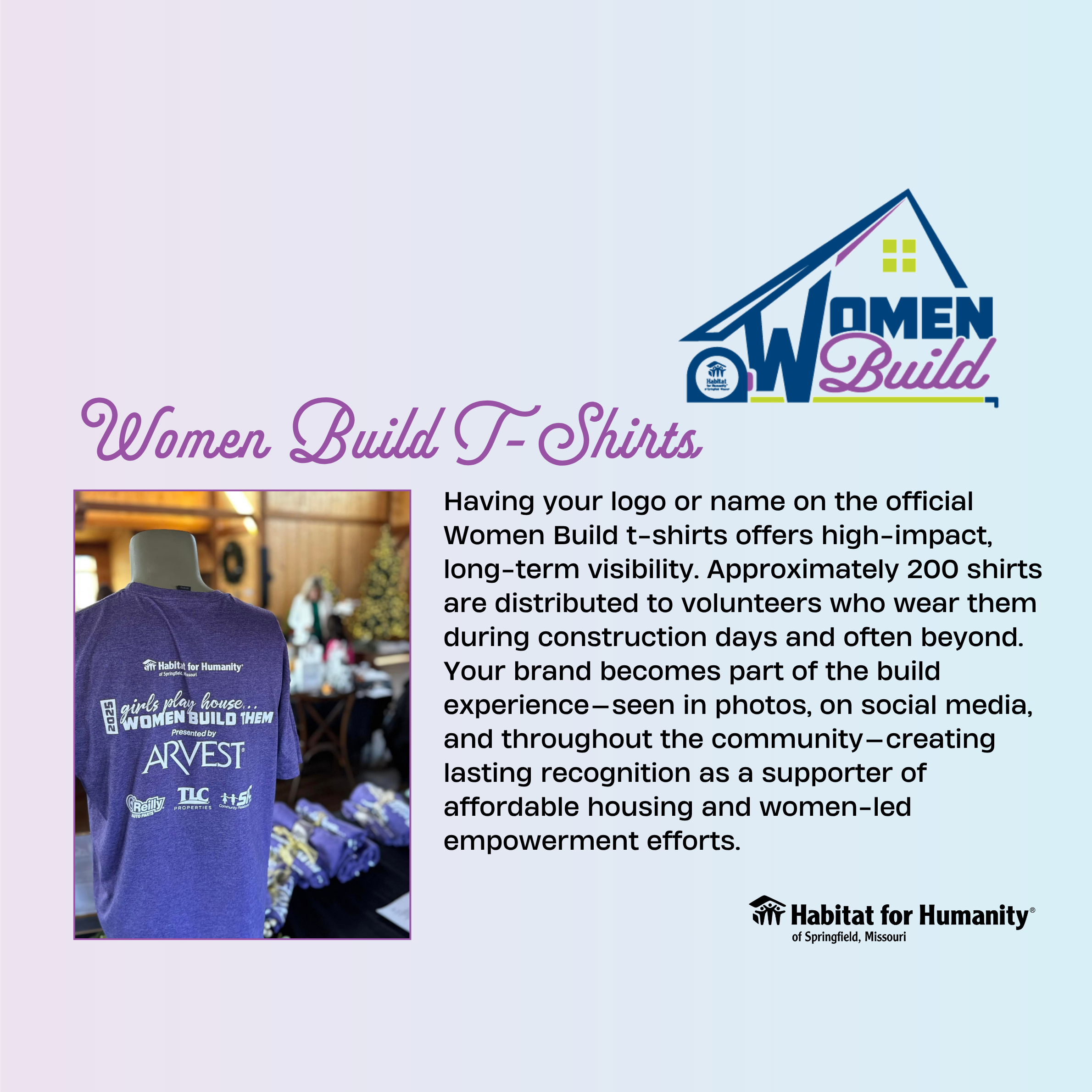 At Habitat for Humanity of Springfield, Missouri, we believe in the strength and leadership of women. Women Build empowers women-led teams to step up, swing a hammer, and make a lasting impact by helping build safe, affordable homes for families in our community. We are proud to be partnering with many companies in our own community in support of this effort!