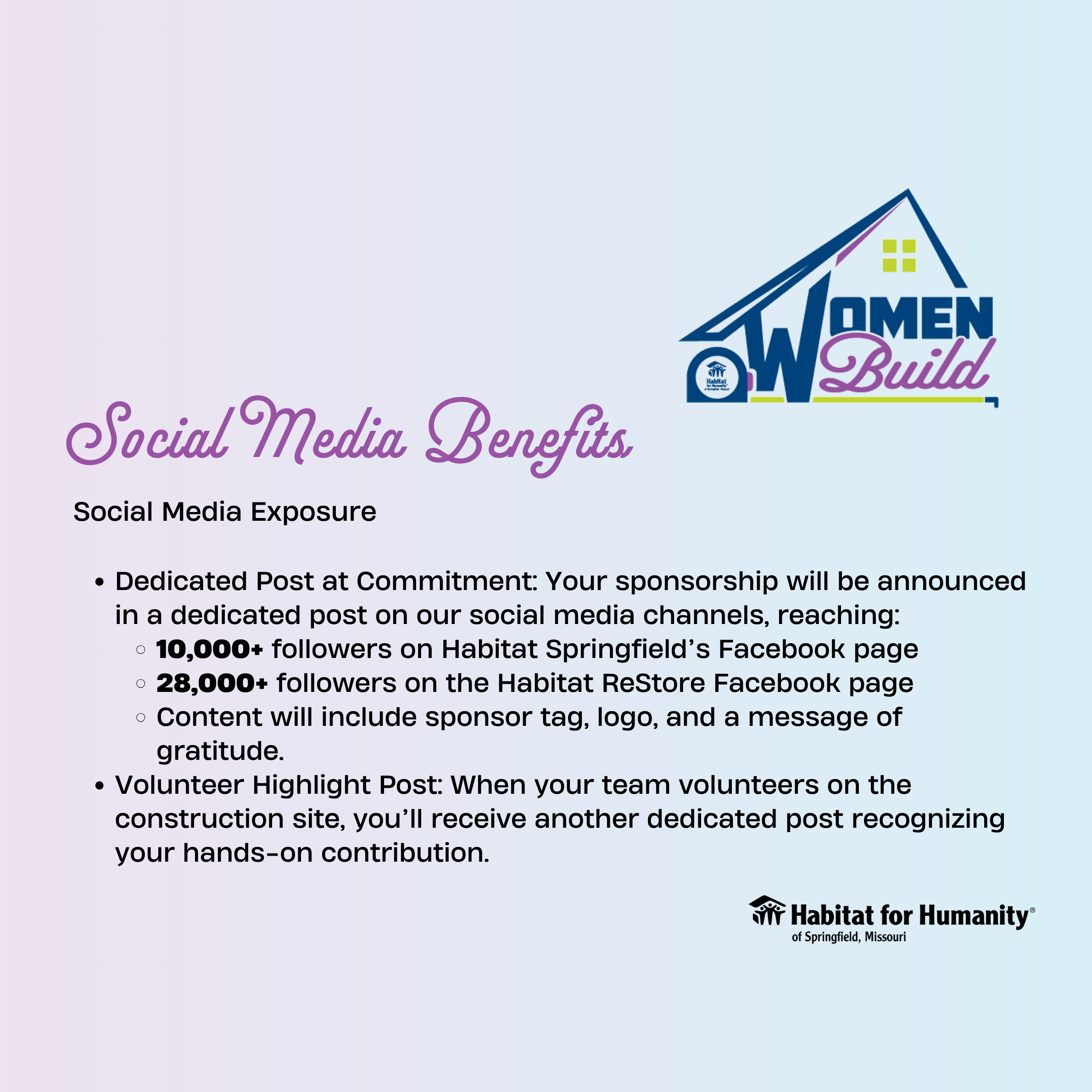 Sponsorship provides funding for home building, while also promoting community engagement and awareness about housing issues. Sponsors get a variety of perks, including: logo placement, preferential team build days and t-shirts!